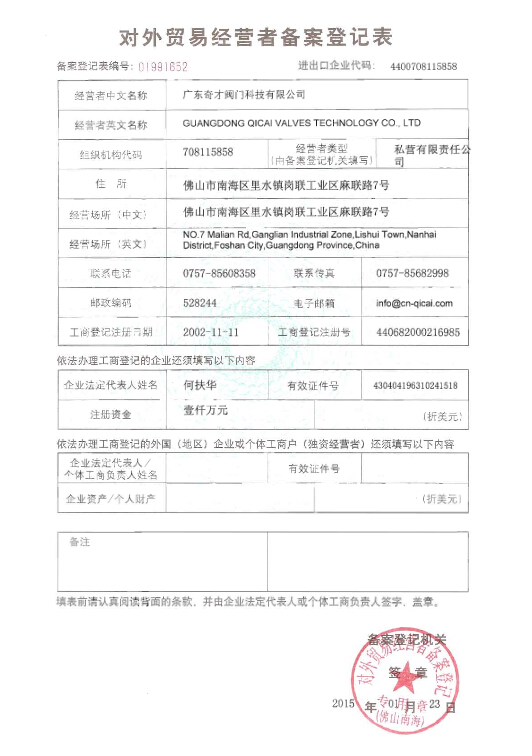 對(duì)外貿(mào)易經(jīng)營(yíng)者備案登記證2015